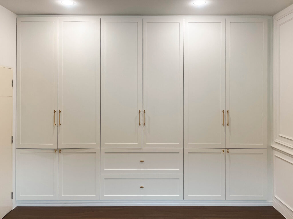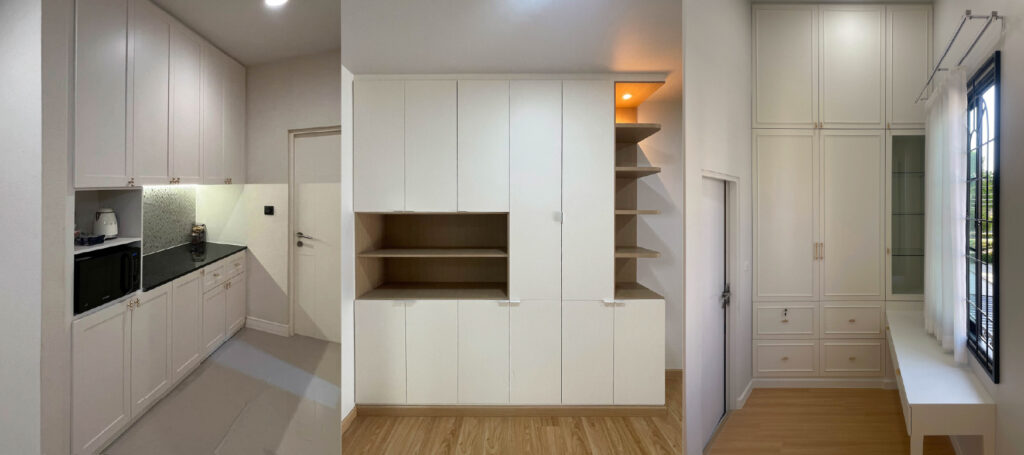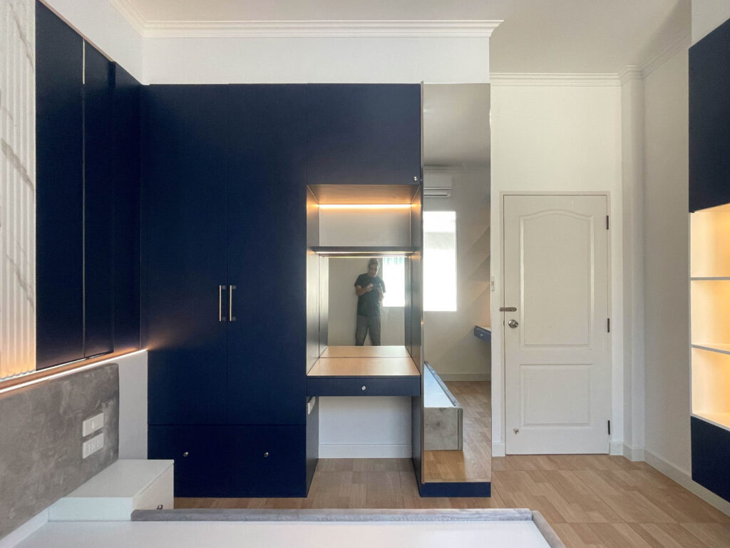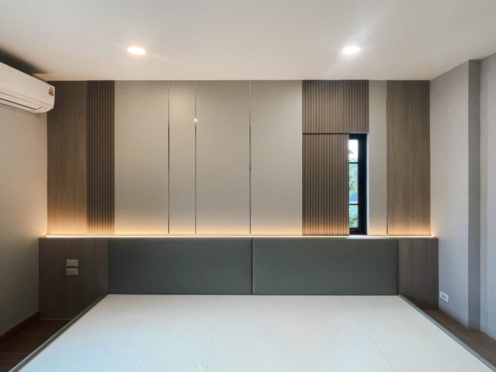 ชิ้นงานส่วนใหญ่ เน้นที่งานตกแต่งหัวเตียง โดยเฉพาะงานทำบานซ่อนสำหรับ ปิด – เปิด หน้าต่าง และ ฐานที่นอนบลิ้วอิน ดีไซน์ล้อไปกับตัวห้อง